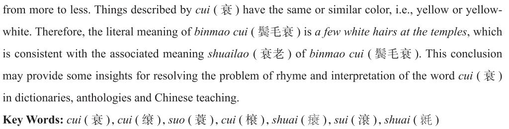 李军. “乡音无改鬓毛衰”之“衰”字音义的词源学解释[J]. 汉字汉语研究, 2020, 11(3): 11-21.