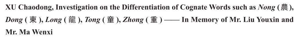 徐朝东. 農”“東”“龍”“童”“重”组同源词分化之考察——为纪念刘又辛、马文熙先生而作[J]. 汉字汉语研究, 2020, 11(3): 3-10.
